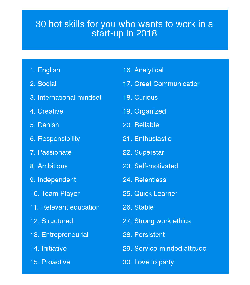 Do not hesitate to read on, because Finduddannelse.dk, a Danish search engine for education, has the answers for you right here. They have listed the top 30 skills required below if your dream is to work in a start-up in Denmark.