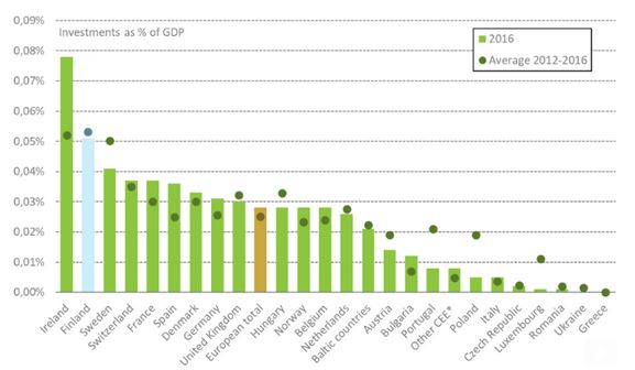Finns can be proud of their rank in the longer term: Finland takes the first place in European venture capital investments between 2012-2016, surpassing known startup giants like Sweden and Ireland.